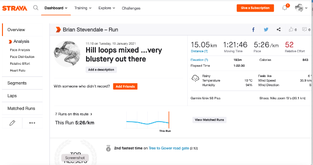 | 15 | 2021-01-21 12:12:18 | Brian Stevendale | 00:42:44 | 104.99 | swansea harriers | Link | ![]() | |
