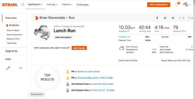 | 12 | 2021-01-16 11:52:10 | Brian Stevendale | 01:12:23 | 557.74 | swansea harriers | Link | ![]() | |