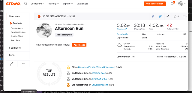 | 23 | 2021-01-28 21:13:12 | Brian Stevendale | 00:20:18 | 45.93 | swansea harriers | Link | ![]() | |